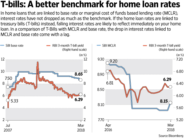 The RBI has said many times that there is no transparency in the way floating interest rate on home loans is calculated, and that there is need for a benchmark rate that is market linked so that any change in policy rates can be passed on to the consumers. Usually, banks keep the rates high even in a falling interest rate regime and you don’t see an immediate impact or cut in policy rates. To understand if home loans linked to T-Bills will bring in transparency, we compared T-Bills with MCLR and base rate. If you look at both comparisons, the drop in interest rates linked to MCLR as well as base rate come with a lag. If the home loan rates are linked to T-Bills, the reflection on falling interest rate is likely to be immediate on your home loan. The movement in T-Bill yields is a result of two parameters—repo rate and liquidity. Hence, if it is a falling interest rate regime, the fall will reflect faster in your loan rates.
